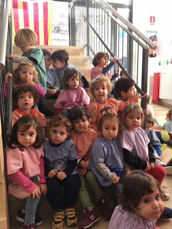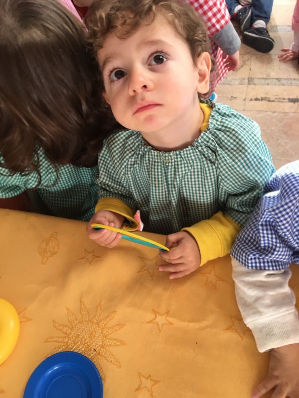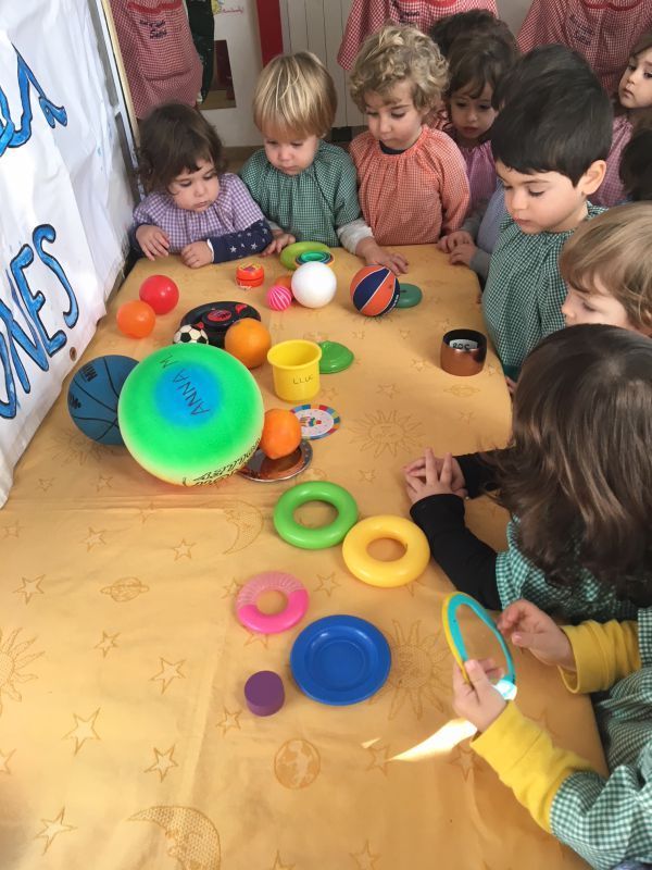 Tot va començar el passat dilluns, quan a ambdues classes es va començar a explicar el conte "La Història d'un cercle", dins del treball de les formes geomètriques a l'escola. I avui, creant l'exposició, han donat un pas de gegant. En la següent imatge, els creadors i les creadores observen el resultat de la seva col·laboració artística