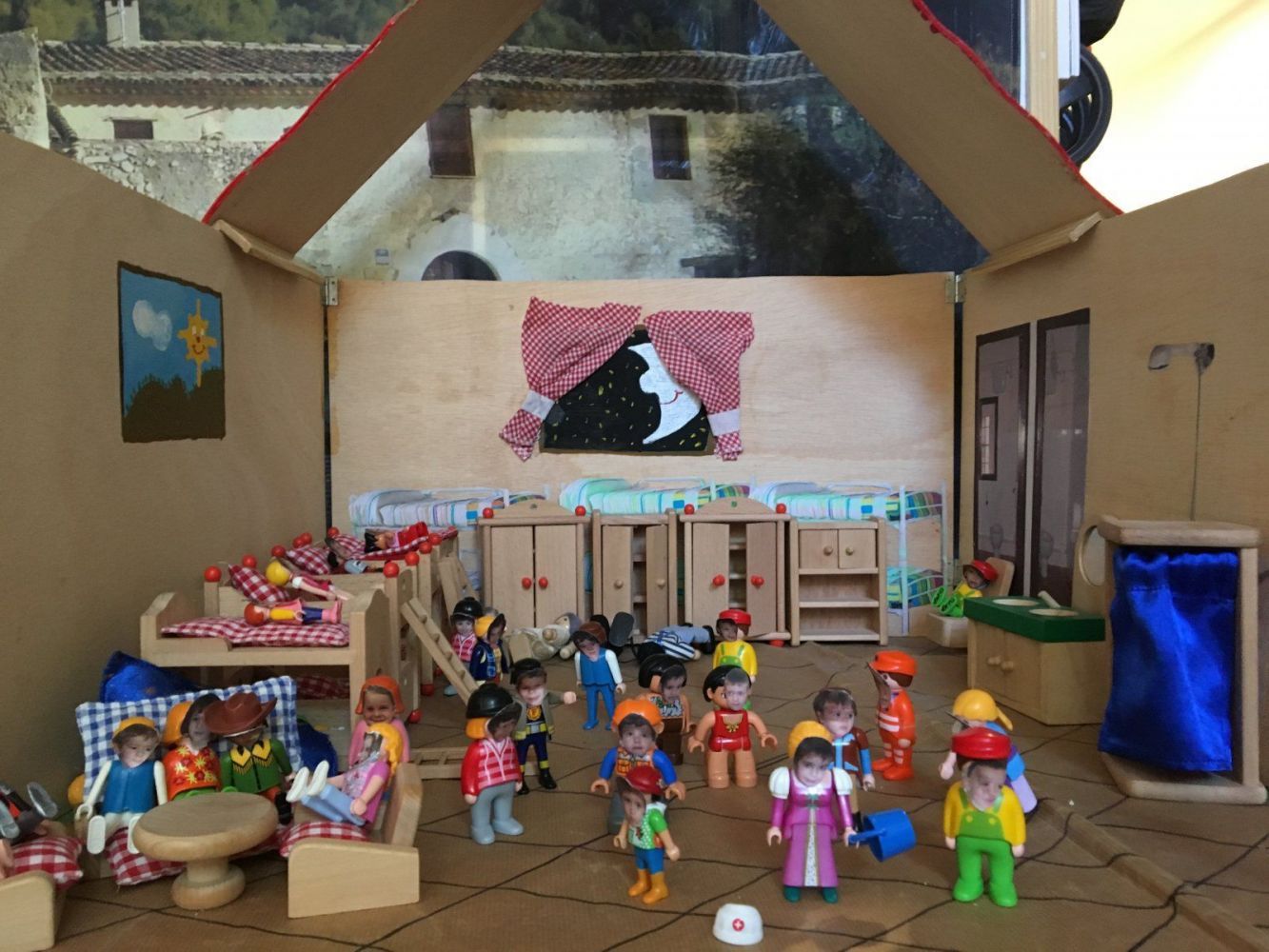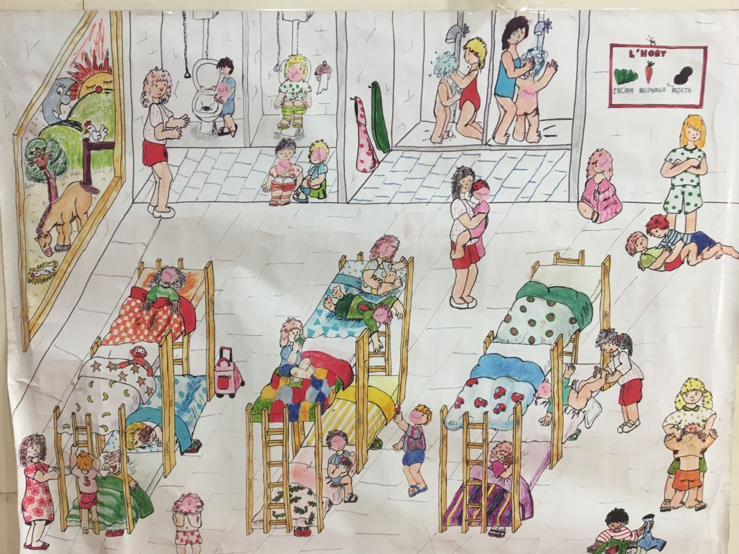 A partir d'aquesta làmina-conte i d'una granja-escola en miniatura que hi ha a l'entrada, les nostres i els nostres aventurers han pogut veure amb què es trobaran, ja sigui jugant amb les figuretes físiques (amb la cara de cadascú enganxada), ja sigui posant un gomet amb el nom al dibuix del nen/a que els agradaria ser... Fixeu-vos que ningú no ha volgut ser dels que es barallen a terra!!! És que són tan bons...